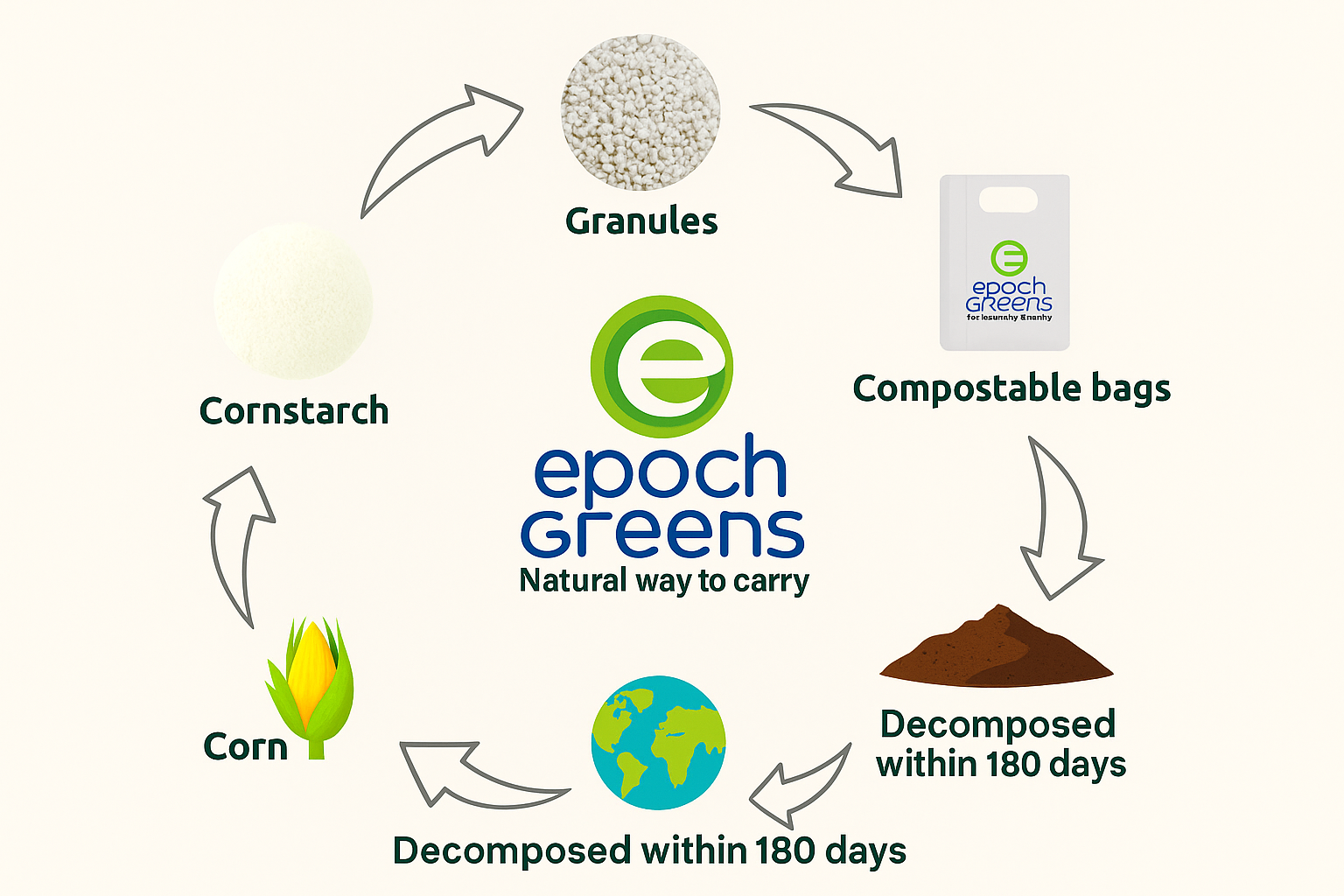 In a world increasingly burdened by plastic pollution, Epoch greens is a purpose driven company working to replace plastic with practical, planet friendly alternatives. Born out of a passion for environmental change, we specialize in manufacturing compostable carry bags smart, sustainable and that are safe for the Earth and businesses. Our products are made from natural, renewable resources such as Cornstarch and PLA (polylactic acid). These bags are designed to break down naturally in composting environments without leaving harmful residues.